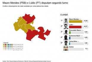 O site UOL disponibilizou a votação por zonas eleitorais em Cuiabá. Os dados do Tribunal Regional Eleitoral mostram que Mauro Mendes (PSB) venceu em quatro delas, contra duas de Lúdio Cabral (PT).