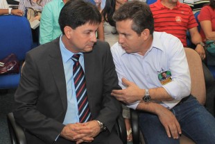 Carlos Brito e Mauro Mendes conversam durante debate no Crea, na campanha eleitoral em 2012