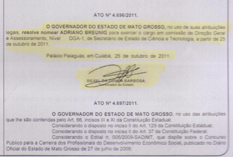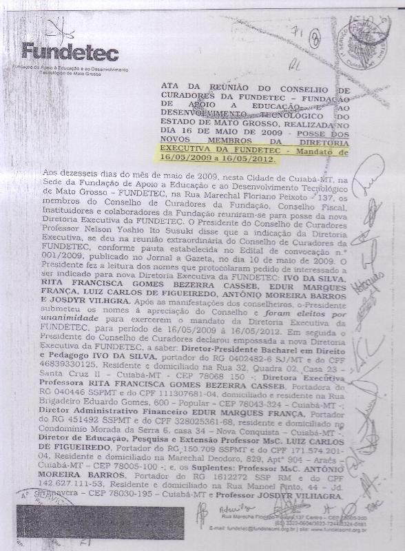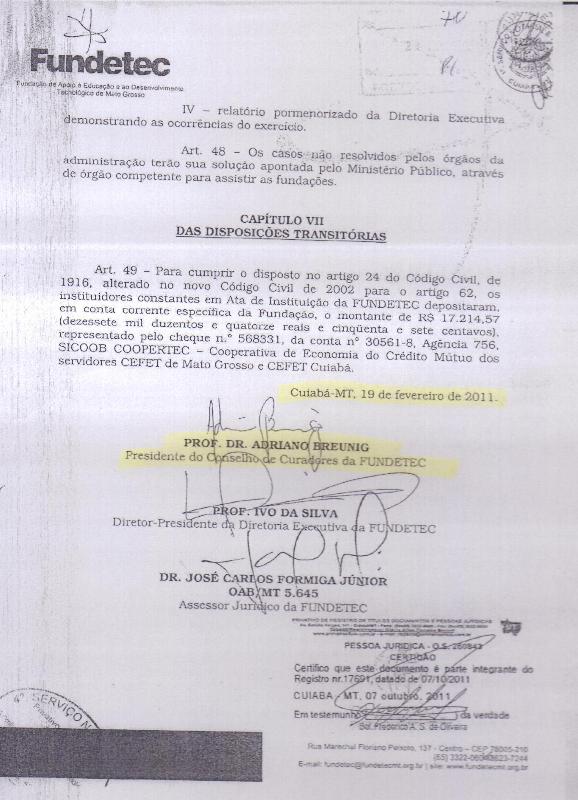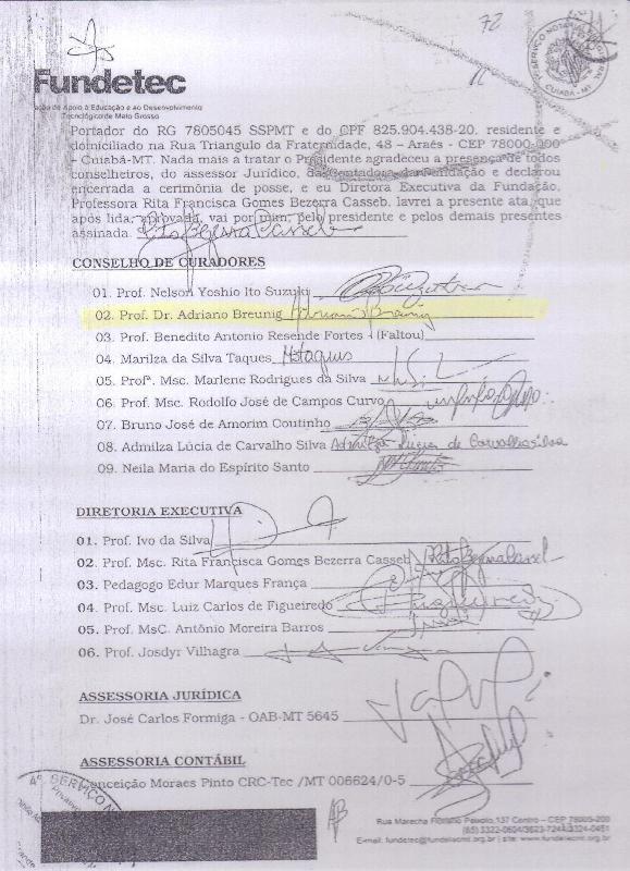 Apesar de a Fundetec ter excluindo o nome de Adriano Breunig do site da entidade, legalmente ele foi o presidente do Conselho Curador até esta quarta-feira, 16/05/2012, como mostra a Figura 01. Na figura 03 é possível ver que Adriano inclusive assinou o estatuto da entidade no dia 19 de fevereiro de 2011, 22 dias após sua posse como secretário adjunto da Secitec.