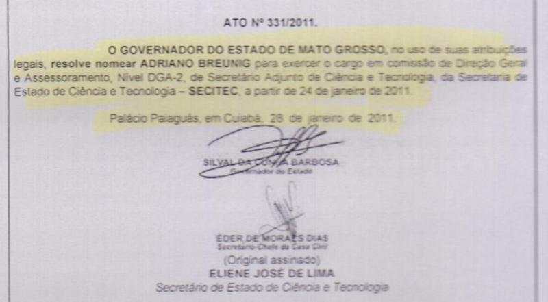 O então secretário estadual de Ciência e Tecnologia, deputado federal Eliene Lima (PP), um dos fundadores da Fundetec, empossou seu colega de profissão e presidente do Conselho Curador da entidade, professor Adriano Breunig como secretário adjunto da pasta no dia 28 de janeiro de 2011.