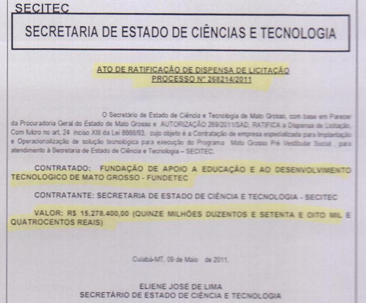 Dois meses depois a Secitec autorizou dispensa de licitação do Processo nº 268214/2011 para contratação imediata da Fundetec pelo valor de R$ 15.278.400,00. Toda essa dinheirama teria sido destinada à implantação e execução do programa MT Preparatório, um cursinho pré-vestibular gratuito para atender estudantes carentes do Estado.