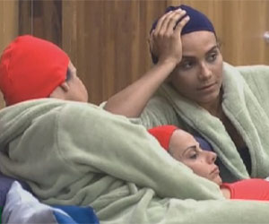 Gretchen, Viviane Araujo e Shayene Cesário conversam no quarto sede na tarde deste sábado (23). As peoas já estão preparadas com roupas específicas para atividade na água que ocorrerá logo mais.