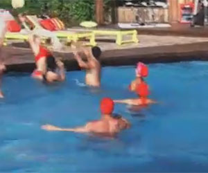 O grupo se divide em duas equipes e entram na piscina para disputar o jogo