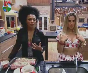 Após curtir a balada, a peoa tomou banho e depois resolveu temperar a carne para o almoço. Enquanto fazia isso, a morena conversou com Robertha Portella na sala da sede na madrugada deste sábado (23).