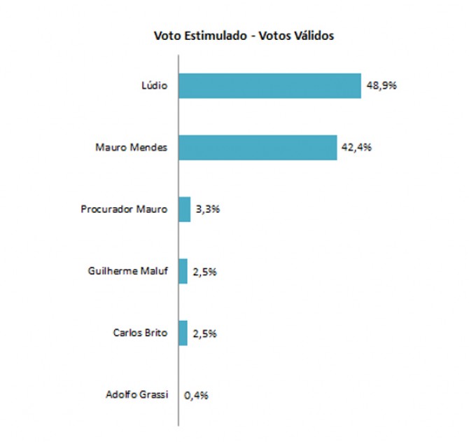 No cálculo dos votos válidos, na modalidade estimulada, em que são excluídos os percentuais de indecisos brancos e nulos, o candidato Lúdio Cabral soma 48,9%, e Mauro Mendes 42,4%.