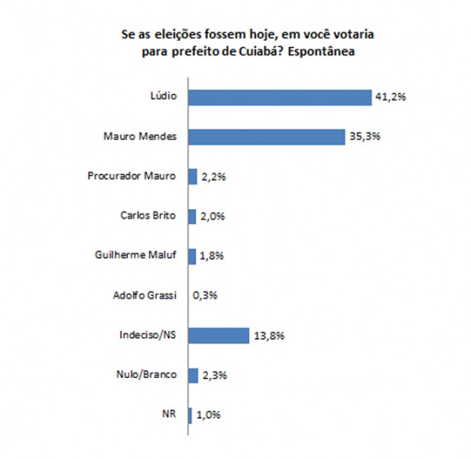 Na pesquisa espontânea, quando não é mostrada ao eleitor uma relação com os nomes dos candidatos, Lúdio Cabral aparece com 41,2%; seguido por Mauro Mendes com 35,3%.