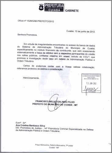 Ofício enviado pelo prefeito Galindo ao Ministério Público Estadual, em junho passado
