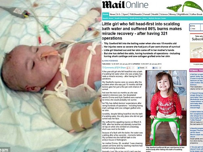 Aos 15 meses de idade, a inglesinha Tilly Sawford sofreu queimaduras em 86% de seu corpo após cair acidentalmente em uma banheira com água fervente.Atualmente, com cinco anos e após 321 cirurgias, a menina, que tinha apenas 5% de chance de sobreviver, está em pleno processo de recuperação e já consegue dar os primeiros passos com a ajuda de um andador.