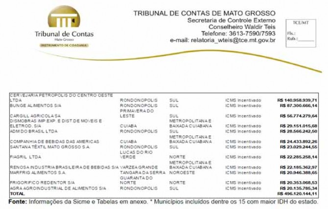 Segundo o relatório do TCE, de 2008 a 2011, houve uma concentração de renúncia em Rondonópolis, Cuiabá, Várzea Grande e Lucas do Rio Verde.