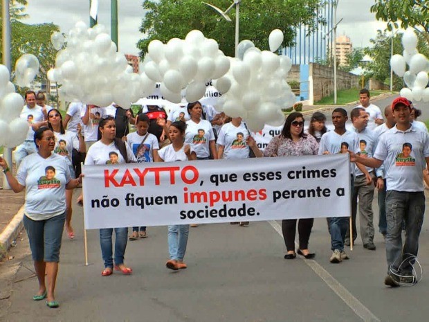 Familiares do menino Kaytto Guilherme do Nascimento Pinto, de 10 anos, que foi assassinado há quatro anos, foram às ruas nesta segunda-feira (15) protestar contra a violência e cobrar rapidez no julgamento de crimes contra crianças. A manifestação foi realizada no Centro de Cuiabá, perto do local onde o corpo foi encontrado. Antes de ser morto, o garoto sofreu violência sexual. O grupo segurou balões brancos, faixas e camisetas com a foto da vítima. O assassino confesso de Kaytto foi condenado a 35 anos e três meses de prisão. (Foto: Reprodução / TVCA)