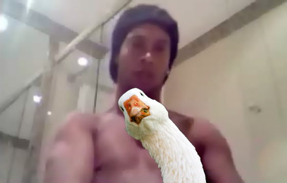 Sem camisa, Ronaldinho conversa com alguém pelo computador, dentro de um banheiro, e faz caras e bocas para a câmera.